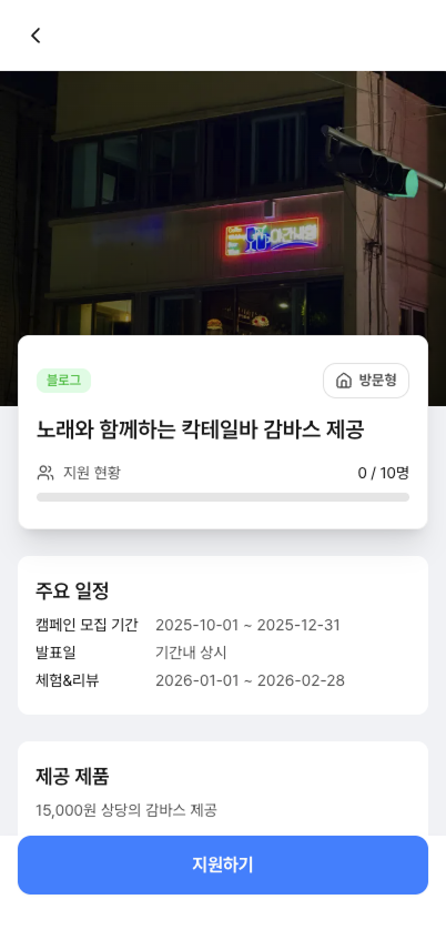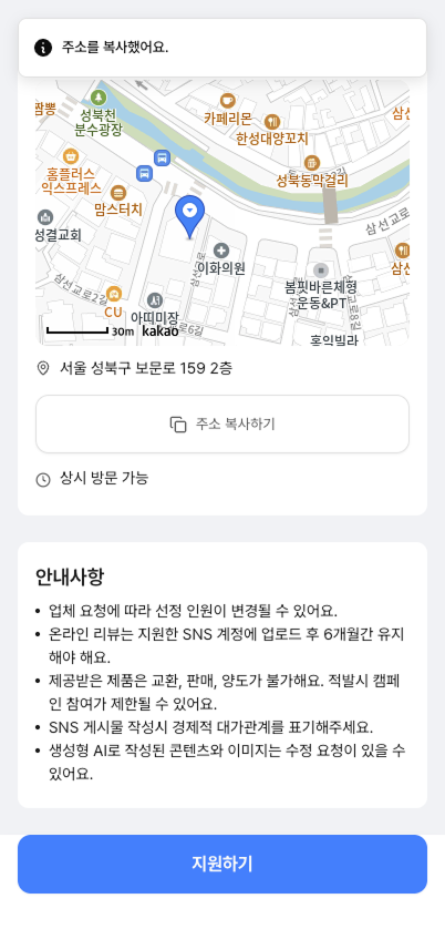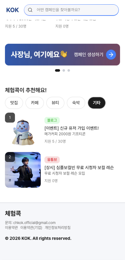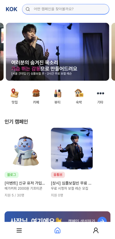 "우리 가게 스토리를 - 콕!"을 슬로건으로, 소상공인과 체험단을 연결하는 캠페인 플랫폼 서비스입니다. 인프라 구축부터 프론트엔드 개발, 디자인 시스템까지 담당했습니다.